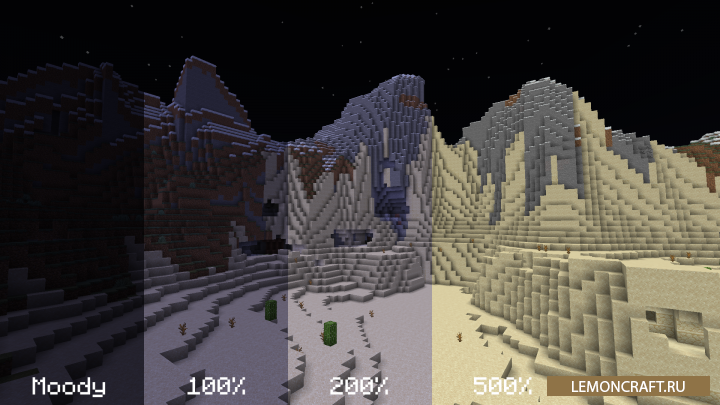 Мод на повышенную яркость Boosted Brightness добавляет в игру возможность изменить яркость игры больше чем на стандартные +100%. После установки мода вы сможете увеличить яркость экрана до 1200%. В результате в самых темных биомах вы будете чувствовать себя как днем. Для увеличения яркости, по умолчанию, назначена кнопка b, с ее помощью вы можете изменить стандартную яркость на повышенную. Для примера, данная функция окажется очень полезной для исследования пещер.
